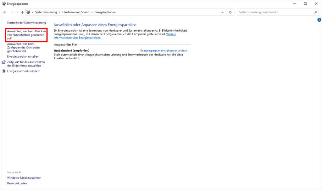 Klicke oben links auf „Auswählen, was beim Drücken von Netzschaltern geschehen soll“.