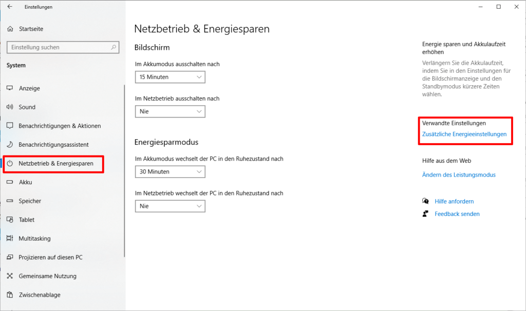 Klicke dann rechts auf „Zusätzliche Energieeinstellungen“.